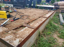 Для начала мы крепим к периметру цоколя металлическую планку, которая послужит бортом для брусчатки. Для придания необходимой жёсткости навариваем на железо необходимые элементы, тем самым надёжно закрепляя планку.